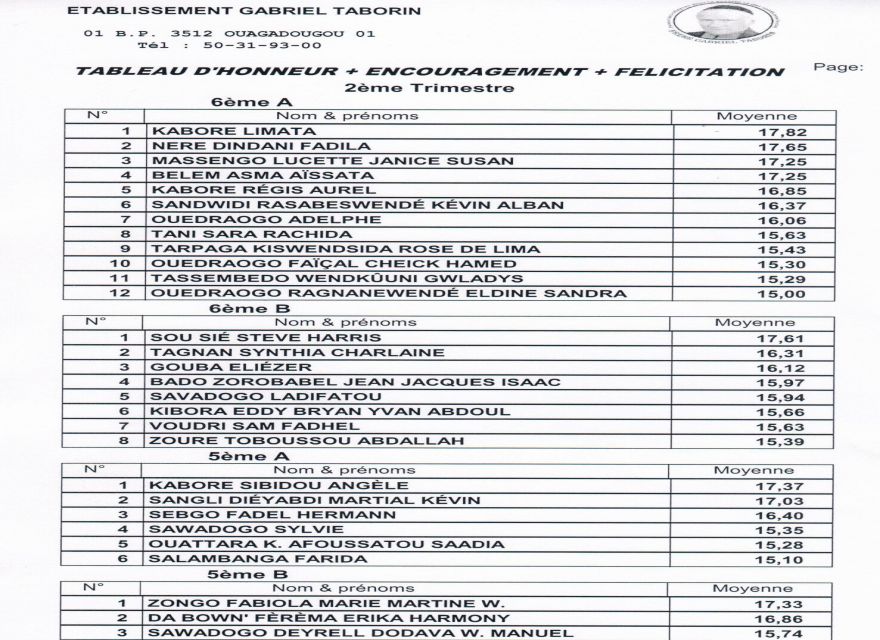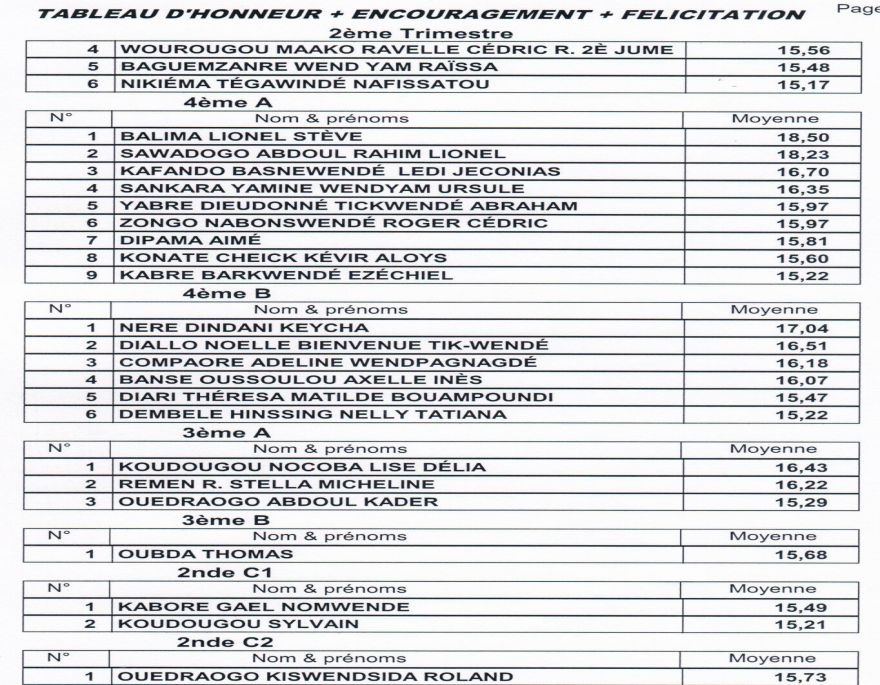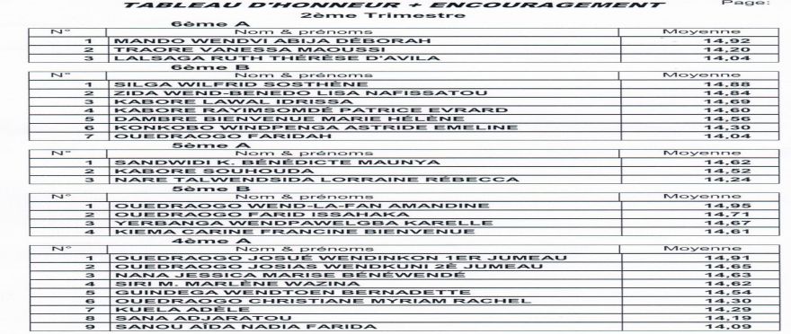 Tableaux d'honneur du 2ème trimestre / Enseignement Général